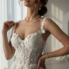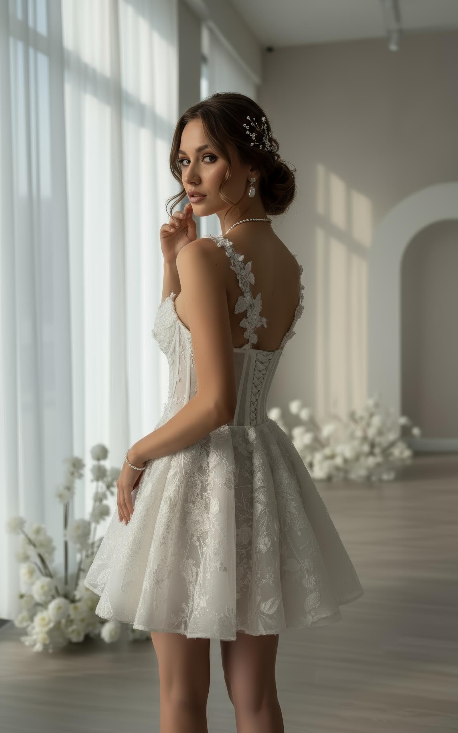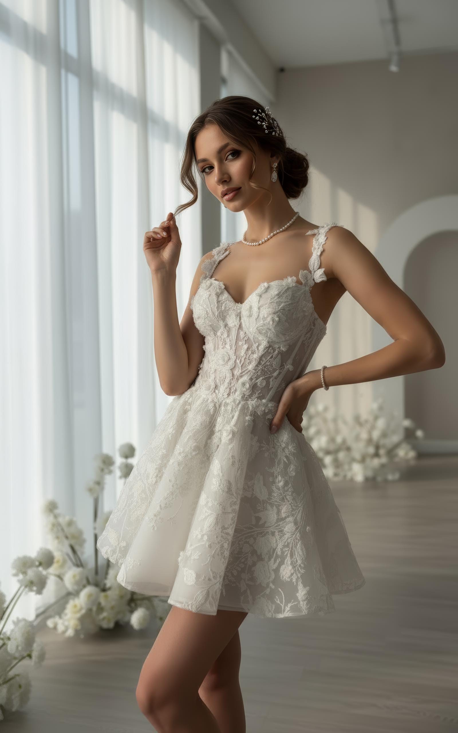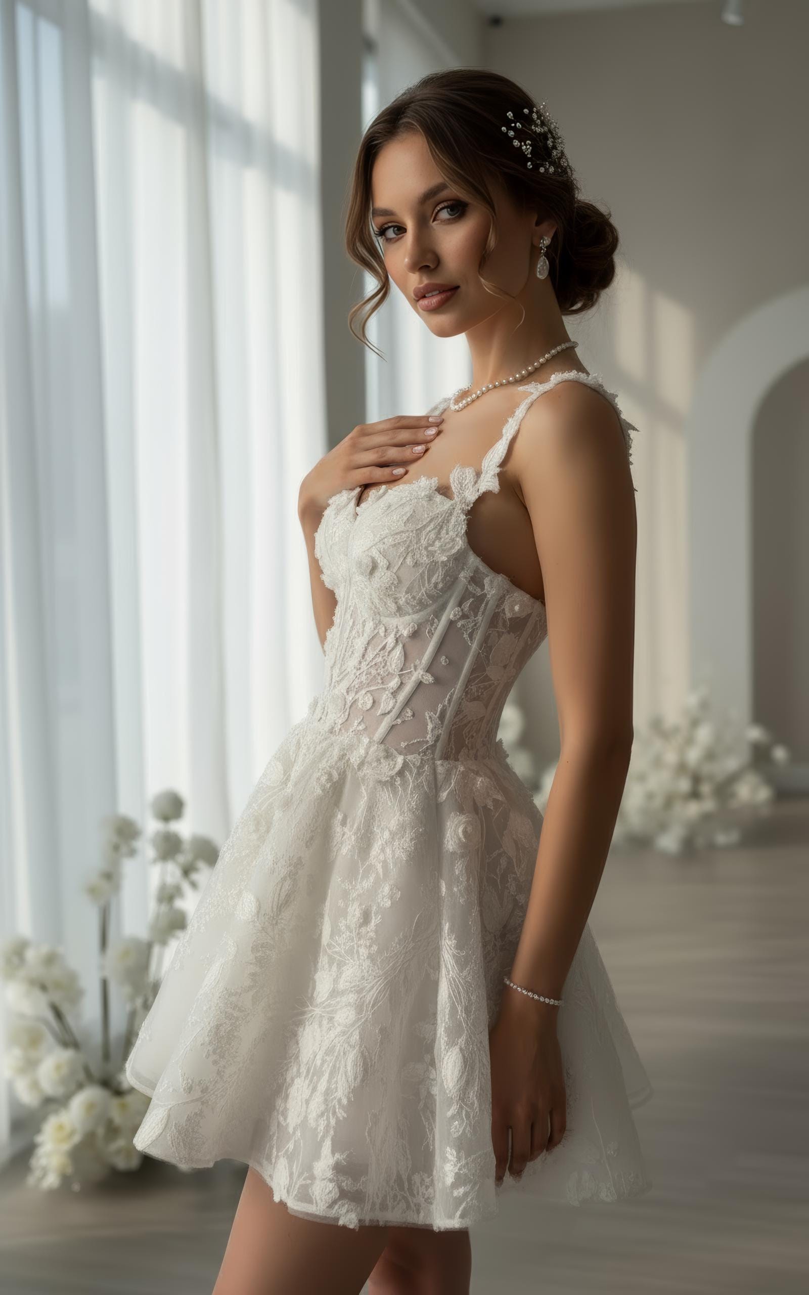Make your moment unforgettable in this short floral lace corset wedding dress, crafted for the modern romantic bride.