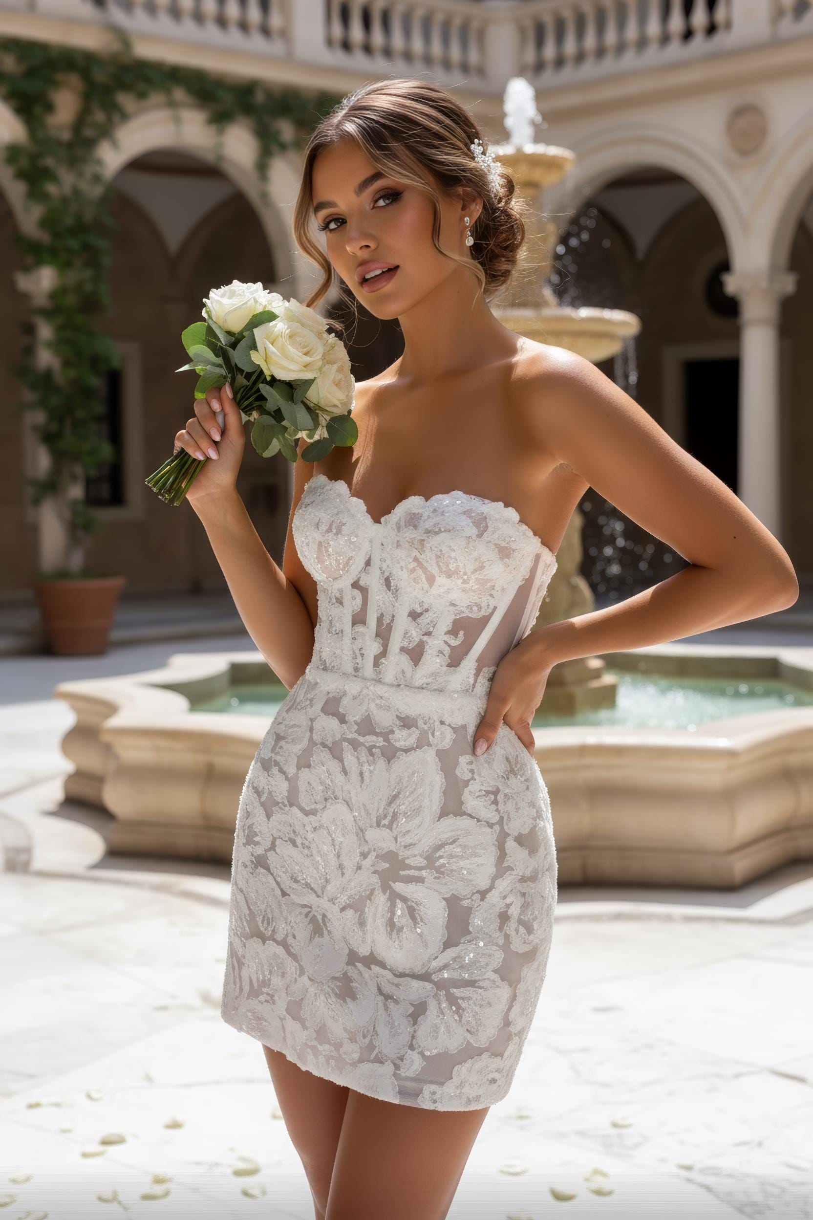 Make a breathtaking entrance in this floral lace corset mini wedding dress, crafted for the modern bride who adores timeless romance.
